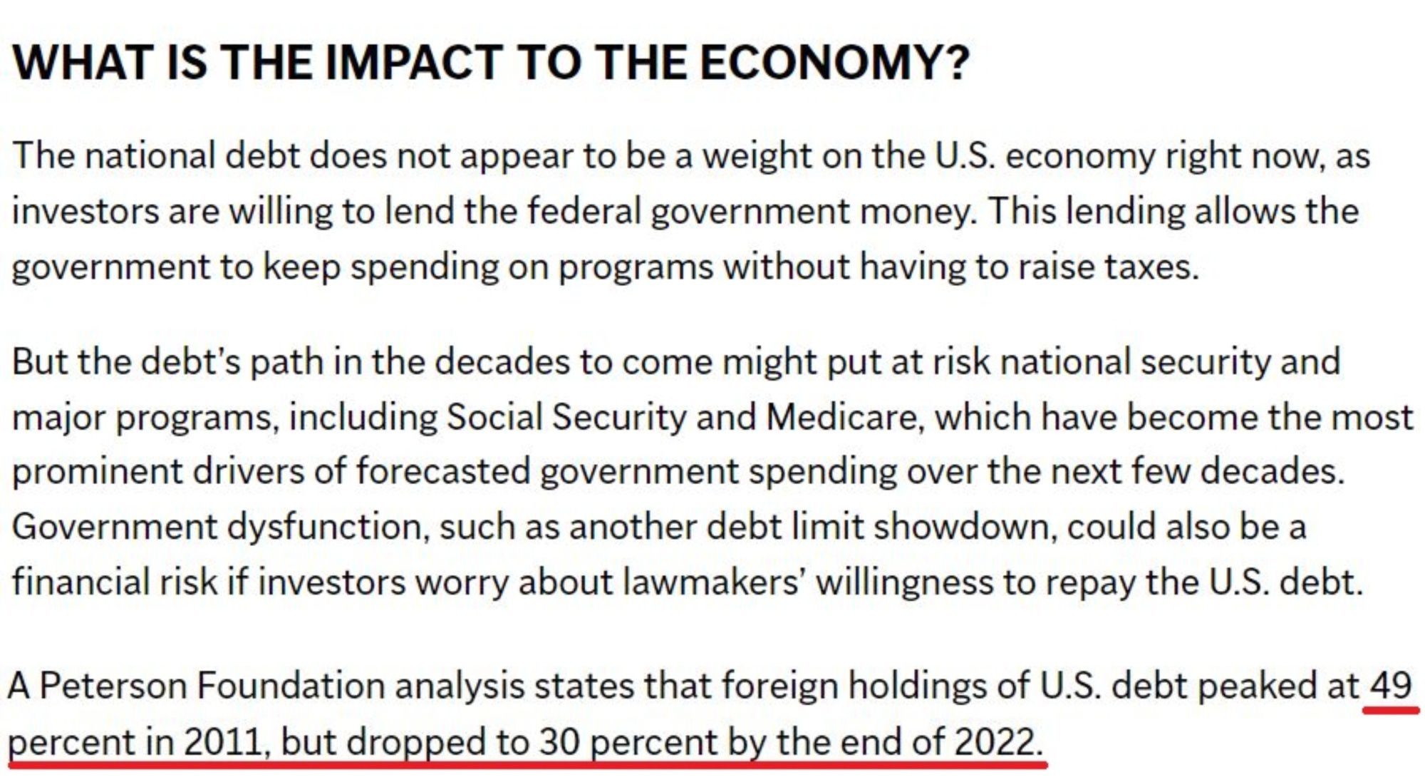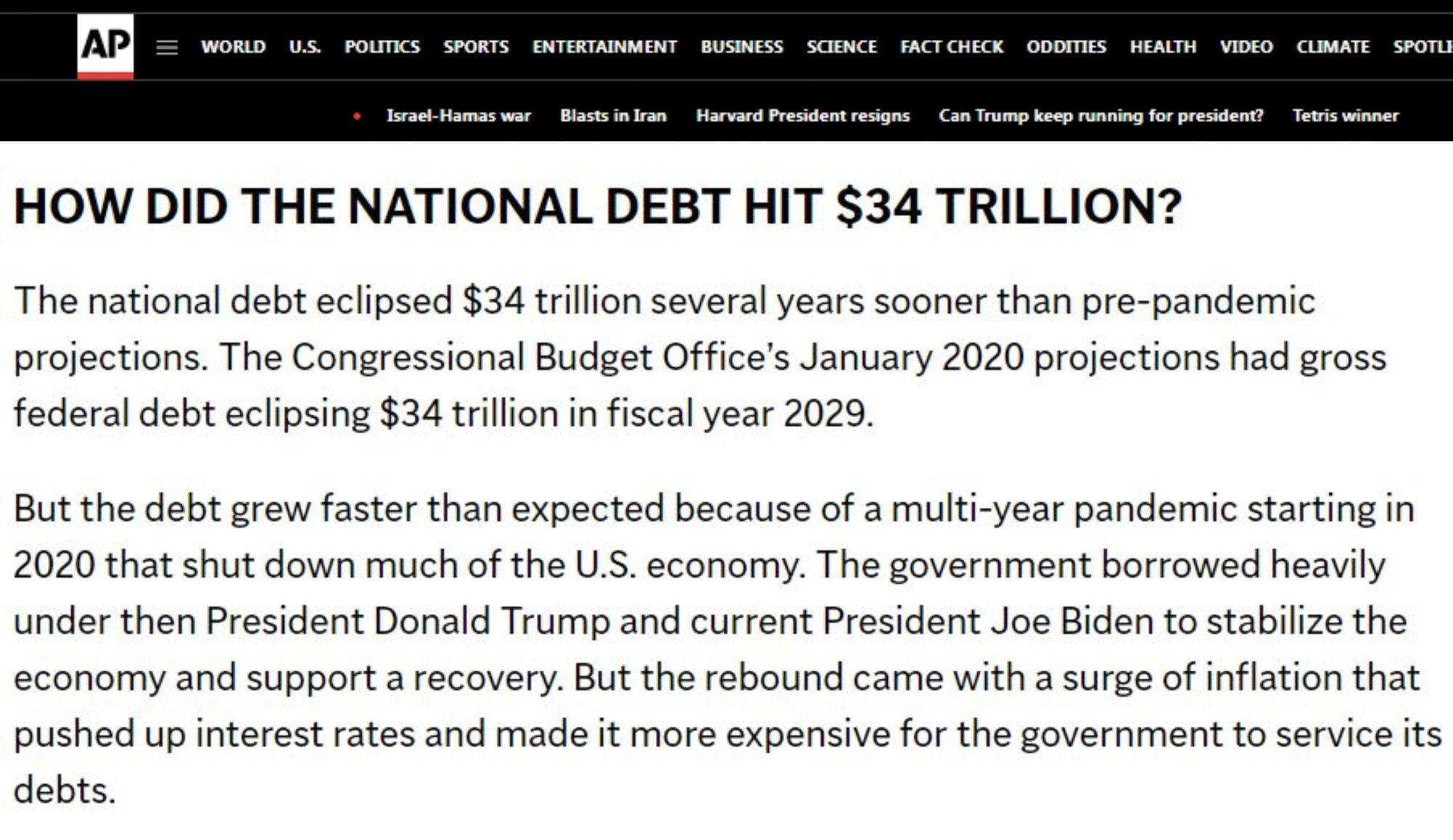 美聯(lián)社的報道指出,正是由于投資者長期以來愿意借錢給美國政府,后者才得以在不增加稅收的情況下持續(xù)花錢。“但未來幾十年的債務(wù)路徑可能會危及美國的國家安全和主要支出項目,包括社會保障和醫(yī)療保險”。