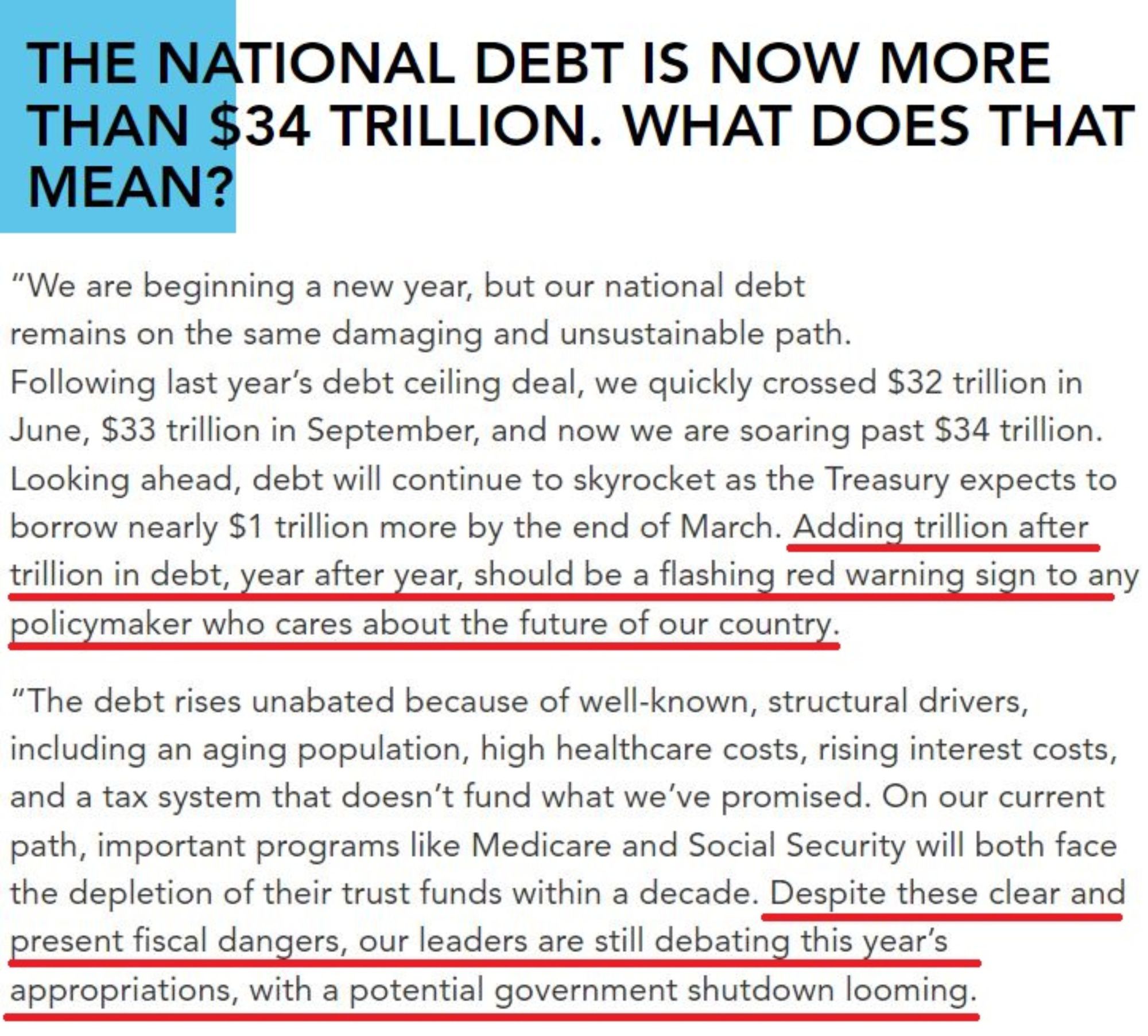 對此,彼得森基金會首席執(zhí)行官邁克爾·彼得森警告稱:“年復(fù)一年地增加一萬億又一萬億的債務(wù),對任何關(guān)心美國未來的政策制定者來說,都應(yīng)該是一個閃爍的紅色警報。”