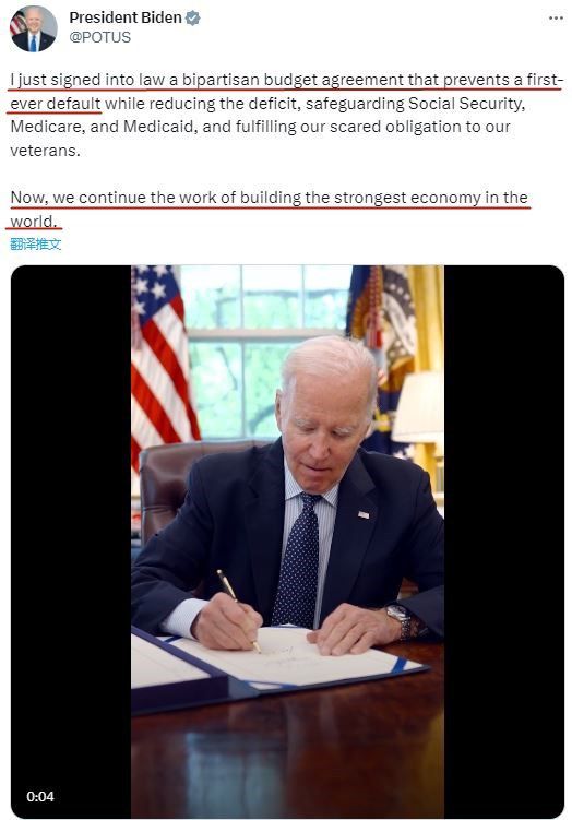 拜登當時在社交媒體上寫道:“我剛剛簽署了一項兩黨預(yù)算協(xié)議,防止有史以來第一次債務(wù)違約……現(xiàn)在,我們將繼續(xù)建設(shè)世界上最強大的經(jīng)濟體?!?/p>