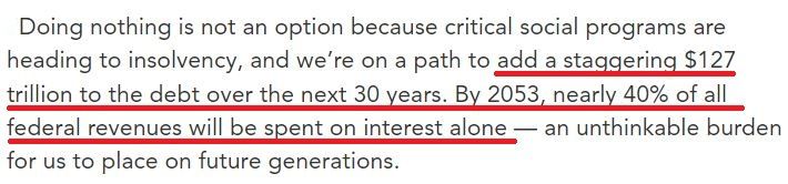 根據(jù)該智庫的預(yù)測,美國在未來30年將在現(xiàn)有基礎(chǔ)上再增加127萬億美元債務(wù);到2053年,光是利息成本就要用掉近40%的聯(lián)邦財政收入。