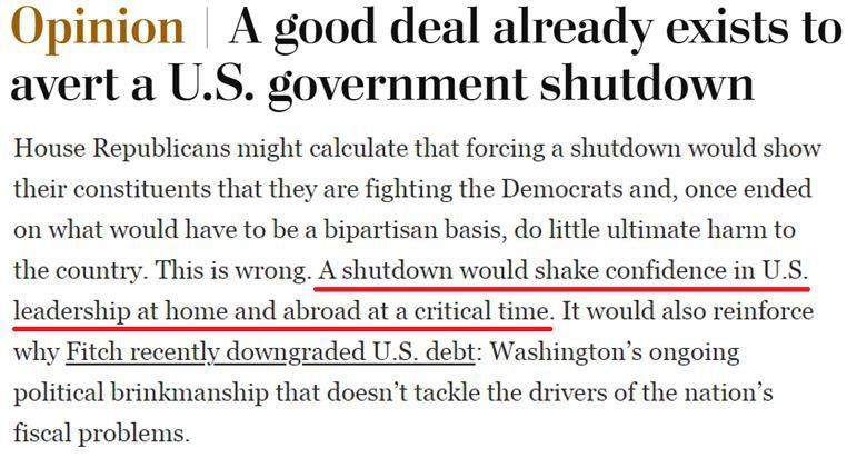有美媒評論指出,政府關(guān)門將動搖國內(nèi)外對美國領(lǐng)導(dǎo)層的信心,而這也將進一步坐實國際評級機構(gòu)對美國信用“降級”的原因:華盛頓持續(xù)的政治脅迫政策無法解決日益惡化的財政問題。