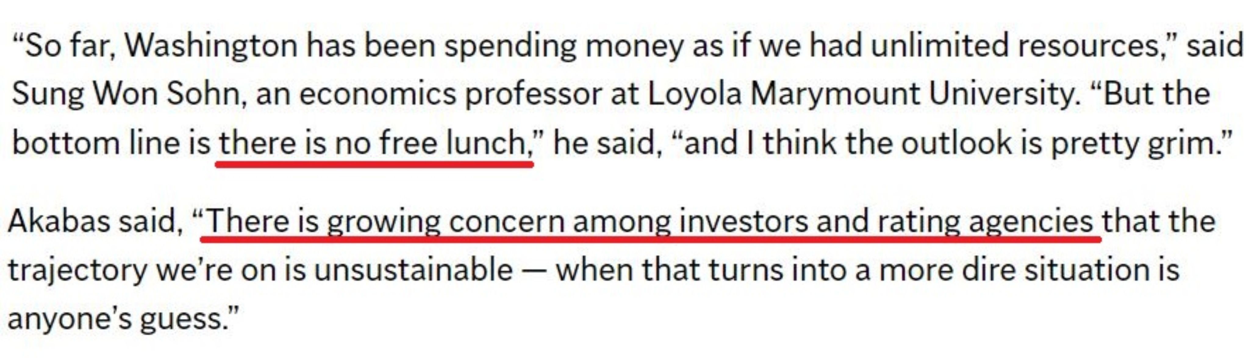 用洛杉磯洛約拉馬利蒙特大學(xué)經(jīng)濟專家的話說,“到目前為止,華盛頓一直在花錢,好像我們擁有無限的資源,但天下終究沒有免費的午餐”。