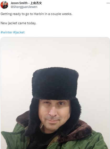 同樣對(duì)哈爾濱充滿(mǎn)興趣的還有美國(guó)人上官杰文。他近日在社交媒體上發(fā)布了一張自己頭戴帽子身穿大衣的照片,配文說(shuō),“準(zhǔn)備幾周后去哈爾濱。新外套送來(lái)了?!?/p>