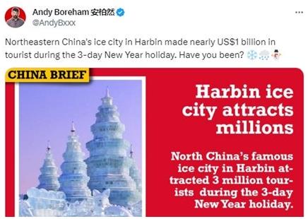 新西蘭媒體人安柏然也在社交媒體上圖文并茂地介紹了哈爾濱的旅游熱潮。對(duì)此,有網(wǎng)友在其帖文下評(píng)論說(shuō),“看上去是個(gè)很棒很受歡迎的地方。這絕對(duì)在我的清單上。”