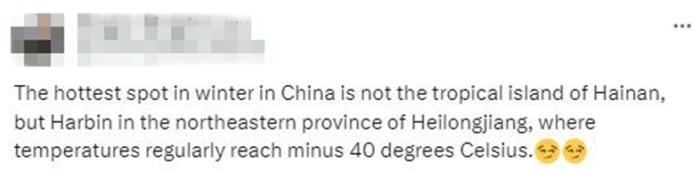 還有網(wǎng)友評(píng)論說(shuō),“中國(guó)冬天最熱的地方,不是海南島,而是黑龍江哈爾濱,盡管那里的氣溫會(huì)達(dá)到零下40攝氏度?!?/p>