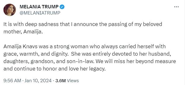 梅拉尼婭在X平臺(tái)上發(fā)文稱,“我懷著沉痛的心情宣布,我深愛(ài)的母親阿瑪利加去世了。阿瑪利加·納夫斯是一名堅(jiān)強(qiáng)的女性,她總是舉止優(yōu)雅、溫暖、莊重?!彼龑?xiě)道,“她深深地愛(ài)著她的丈夫、女兒、外孫和女婿。我們會(huì)無(wú)比地懷念她,也會(huì)繼續(xù)尊重和愛(ài)戴她留下的寶貴財(cái)富。”