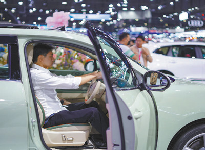 在2023年舉辦的第四十屆泰國(guó)國(guó)際汽車博覽會(huì)上,中國(guó)品牌電動(dòng)汽車訂單量在所有參展品牌中名列前茅。在中國(guó)品牌的強(qiáng)勁拉動(dòng)下,參展電動(dòng)汽車訂單量首次超越燃油汽車訂單量。圖為當(dāng)?shù)貐⒂^者在車博會(huì)上試駕中國(guó)品牌電動(dòng)汽車。