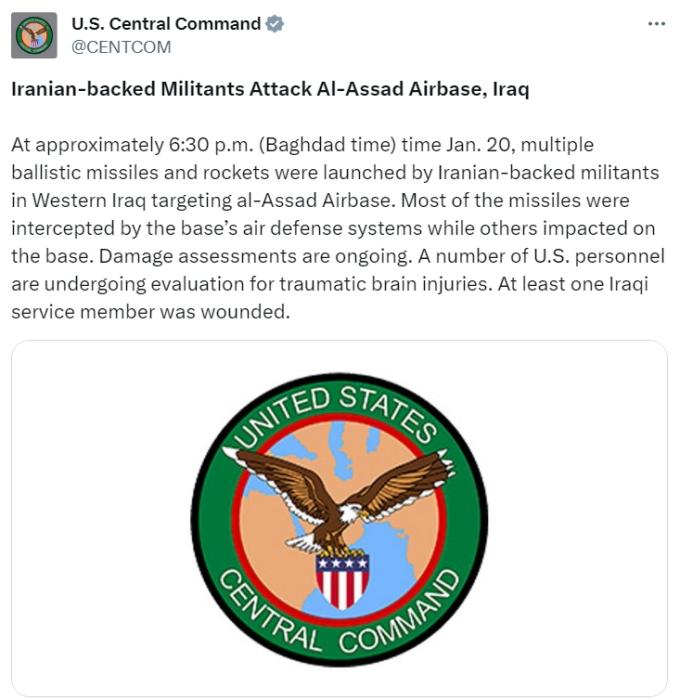 據(jù)報(bào)道,美國中央司令部在一份聲明中稱,伊朗支持的武裝分子20日在伊拉克西部,向阿薩德空軍基地發(fā)射了多枚彈道導(dǎo)彈和火箭彈,其中大部分導(dǎo)彈被基地的防空系統(tǒng)攔截,其他則擊中了基地。