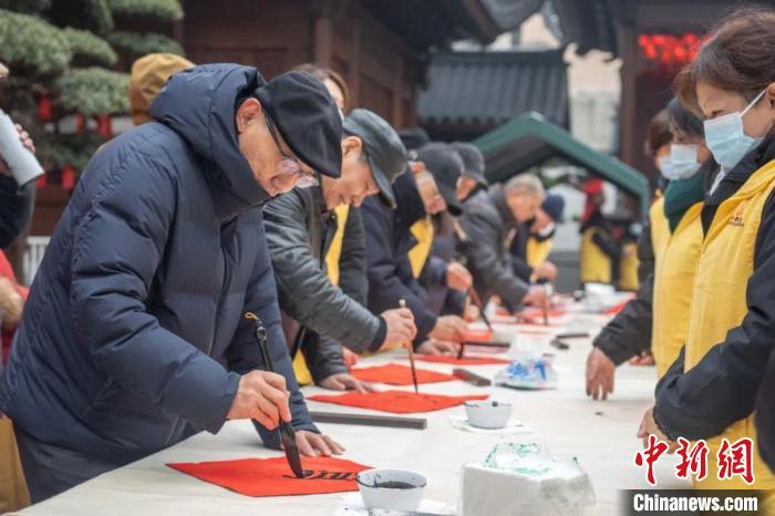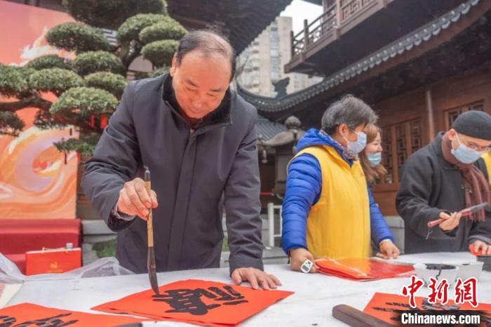 中新網(wǎng)上海1月21日電(記者 范宇斌)21日,“龍興歲時(shí)旺 送福百萬家”——2024年玉佛禪寺新春送?;顒?dòng)在上海玉佛禪寺啟動(dòng)。上海覺群書畫院理事長、玉佛禪寺方丈覺醒法師表示,迎新貼“?!弊质莻鹘y(tǒng)的年俗文化,也是中華兒女對(duì)于美好生活、光明未來的共同期待。