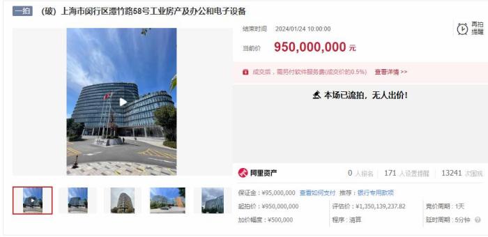 本次拍賣標(biāo)的評(píng)估總價(jià)約為13.5億元,以9.5億元的價(jià)格起拍,約為評(píng)估總價(jià)的7折。拍賣于1月23日上午10時(shí)至1月24日上午10時(shí)止,雖然這場(chǎng)拍賣有超過1.3萬(wàn)人圍觀,但最終無(wú)人出價(jià),以流拍結(jié)束。