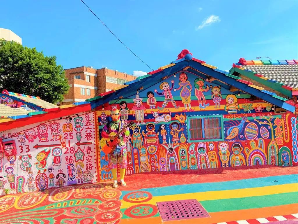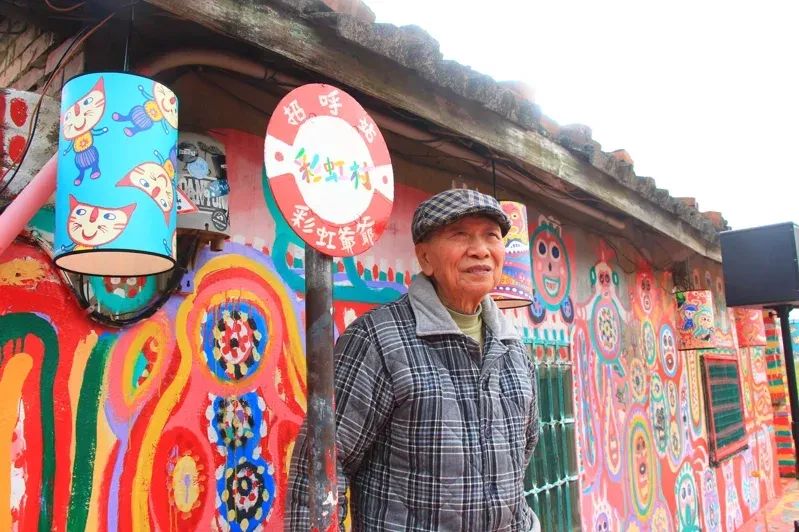 2008年,不舍于老舊眷村拆遷,沒有美術(shù)背景的黃永阜對照報紙副刊上的圖畫照片,開始在住家及鄰近房舍墻上、地面以油漆作畫,創(chuàng)作了許多生動逗趣的人物和動物形象,五彩繽紛、充滿童趣的畫風讓眷村增添了生機,并引起外界關(guān)注,多彩的村子遂被稱為“彩虹眷村”,黃永阜也收獲“彩虹爺爺”稱號。最終,在各方人士奔走爭取下,彩虹眷村被保留了下來。