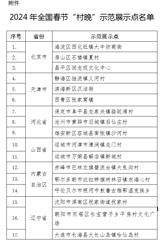 中新網(wǎng)2月1日電 據(jù)文化和旅游部網(wǎng)站消息,文化和旅游部辦公廳近日發(fā)布《關于公布2024年春節(jié)“村晚”示范展示點名單的通知》,根據(jù)文化和旅游部春節(jié)活動有關部署,在各省級文化和旅游行政部門申報推薦的基礎上,文化和旅游部研究確定了2024年春節(jié)“村晚”示范展示點名單。
