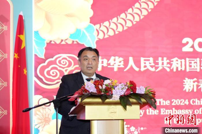 2月2日,中國駐菲律賓大使館在馬尼拉舉辦龍年新春招待會。圖為菲律賓代理外長多明戈現(xiàn)場宣讀菲總統(tǒng)馬科斯新春賀詞。中新社記者 張興龍 攝