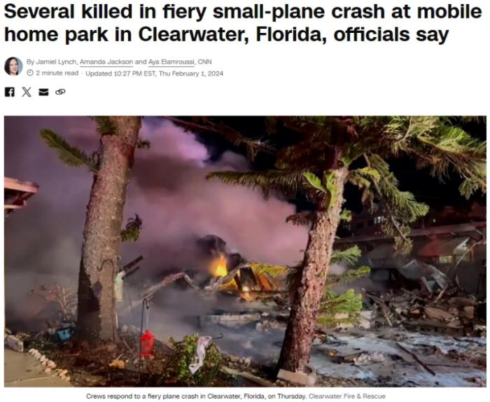 當(dāng)?shù)貢r(shí)間2月1日,美國佛州一架小型飛機(jī)墜毀。圖片來源:美國有線電視新聞網(wǎng)(CNN)報(bào)道截圖