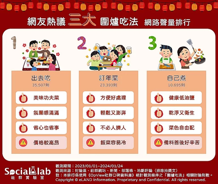 中新網(wǎng)2月5日電 據(jù)臺灣《聯(lián)合報》報道,臺灣有網(wǎng)站通過“OpView社群口碑?dāng)?shù)據(jù)庫”追蹤近一年“圍爐吃法”(年夜飯吃法)話題的網(wǎng)絡(luò)聲量表現(xiàn)。