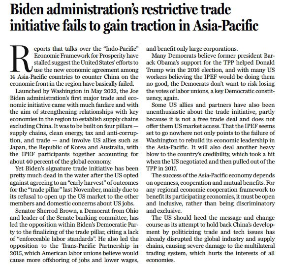 如今美國的一些盟友及伙伴也開始對IPEF失去了熱情,部分原因在于該框架并非自由貿(mào)易協(xié)定,也沒有提供給他們進(jìn)入美國市場的機會。IPEF似乎已經(jīng)是“窮途末路”,它的處境,映證的是美國在重塑亞太地區(qū)經(jīng)濟(jì)領(lǐng)導(dǎo)力方面的失敗,也令美國自2017年退出TPP后再次“信譽掃地”。