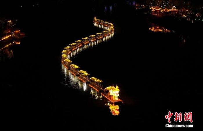 資料圖:一條200米長(zhǎng)的水上金龍?jiān)诎不帐↑S山市休寧縣齊云山鎮(zhèn)橫江江面上游弋而過(guò),龍燈迤邐,與江畔的古民居夜色相映成輝,喜迎新春。施亞磊 攝