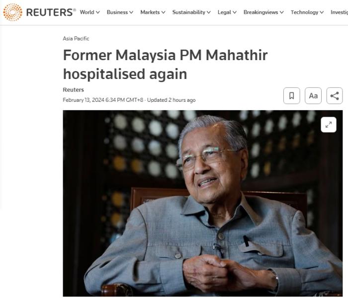 中新網(wǎng)2月13日電 據(jù)路透社和新加坡《聯(lián)合早報(bào)》報(bào)道,98歲的馬來西亞前總理馬哈蒂爾再次入院。其辦公室發(fā)言人13日證實(shí),馬哈蒂爾已經(jīng)入住國(guó)家心臟中心,但沒有透露入院原因。
