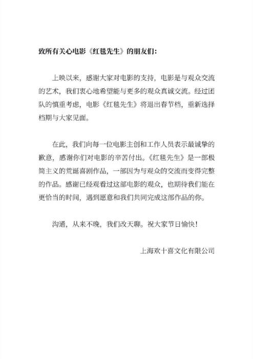 果然,上映6天后,《紅毯先生》宣布撤檔,表示“期待能在更恰當(dāng)?shù)臅r(shí)間,遇到愿意和我們共同完成這部作品的你”。事實(shí)上,這已是該片第二次更換檔期,原本定的上映日期是2023年11月17日。
