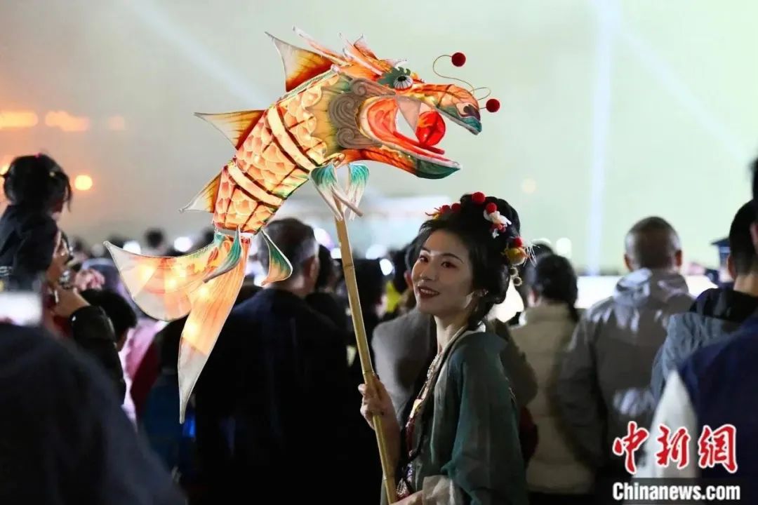 第二十二屆“兩馬同春鬧元宵”燈會上,市民手拿小龍燈游玩。中新社記者 王東明 攝