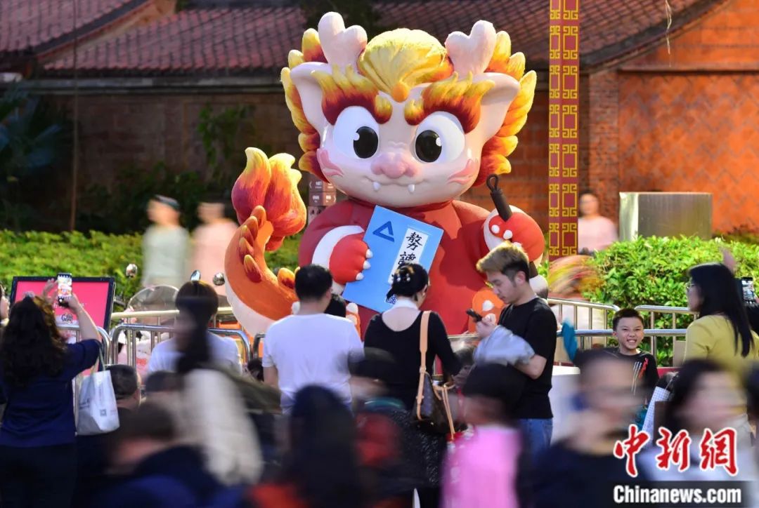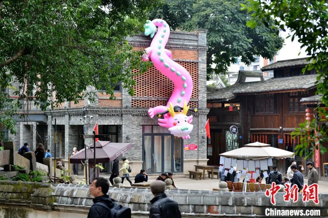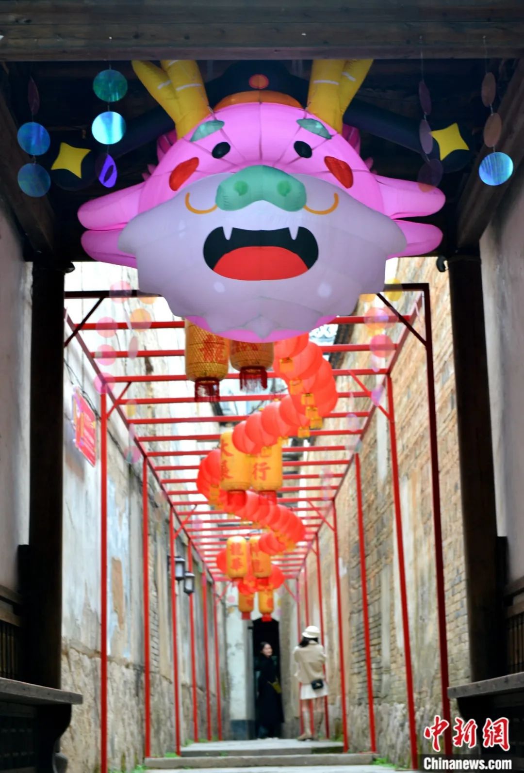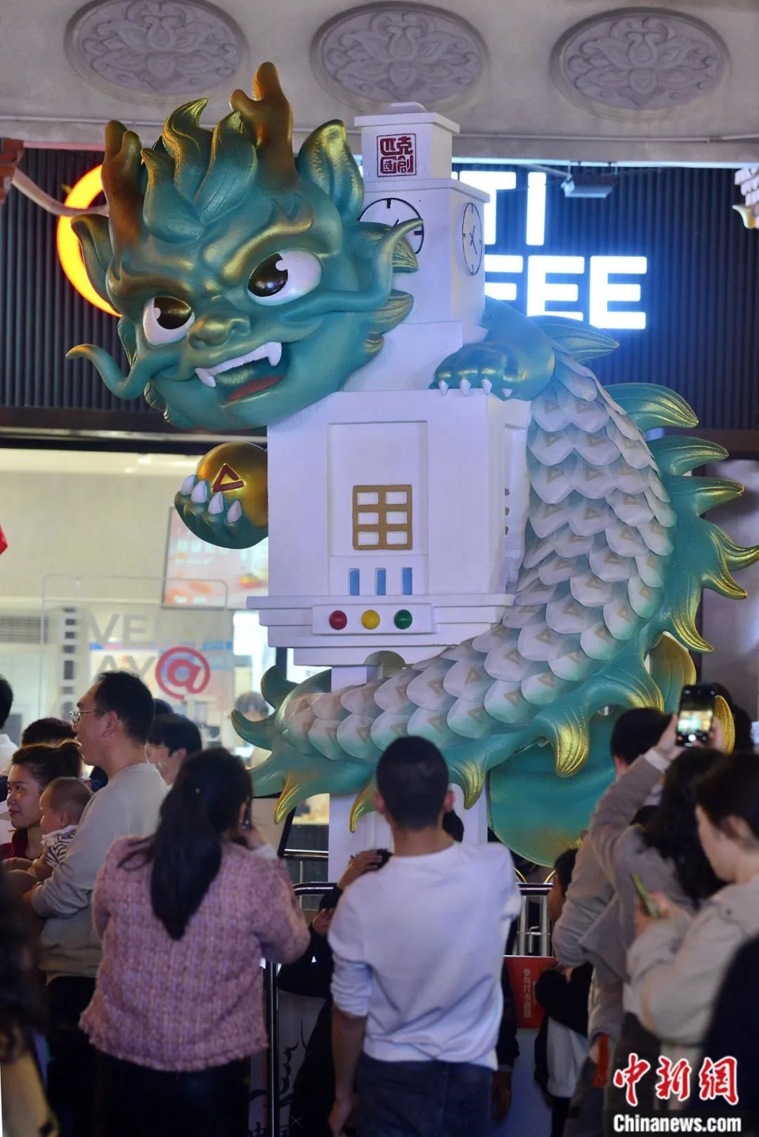“龍元素”藝術(shù)主題裝置亮相福州上下杭?xì)v史文化街區(qū),活潑的造型與古厝形成鮮明對比。中新社記者 呂明 攝