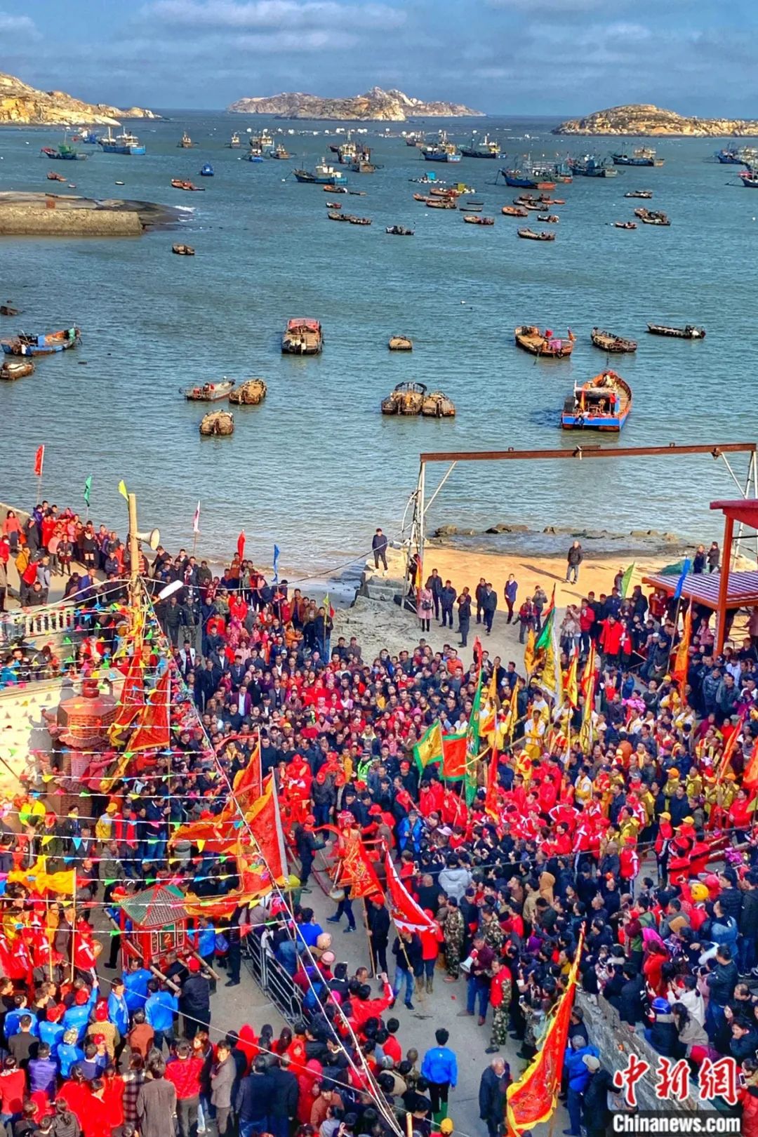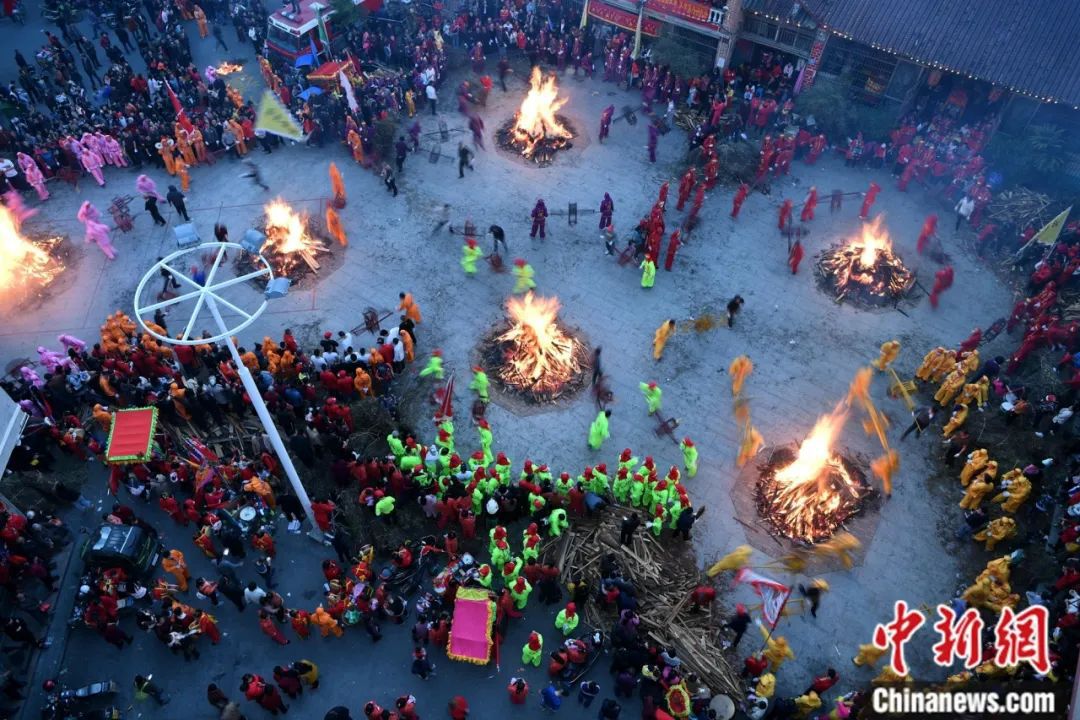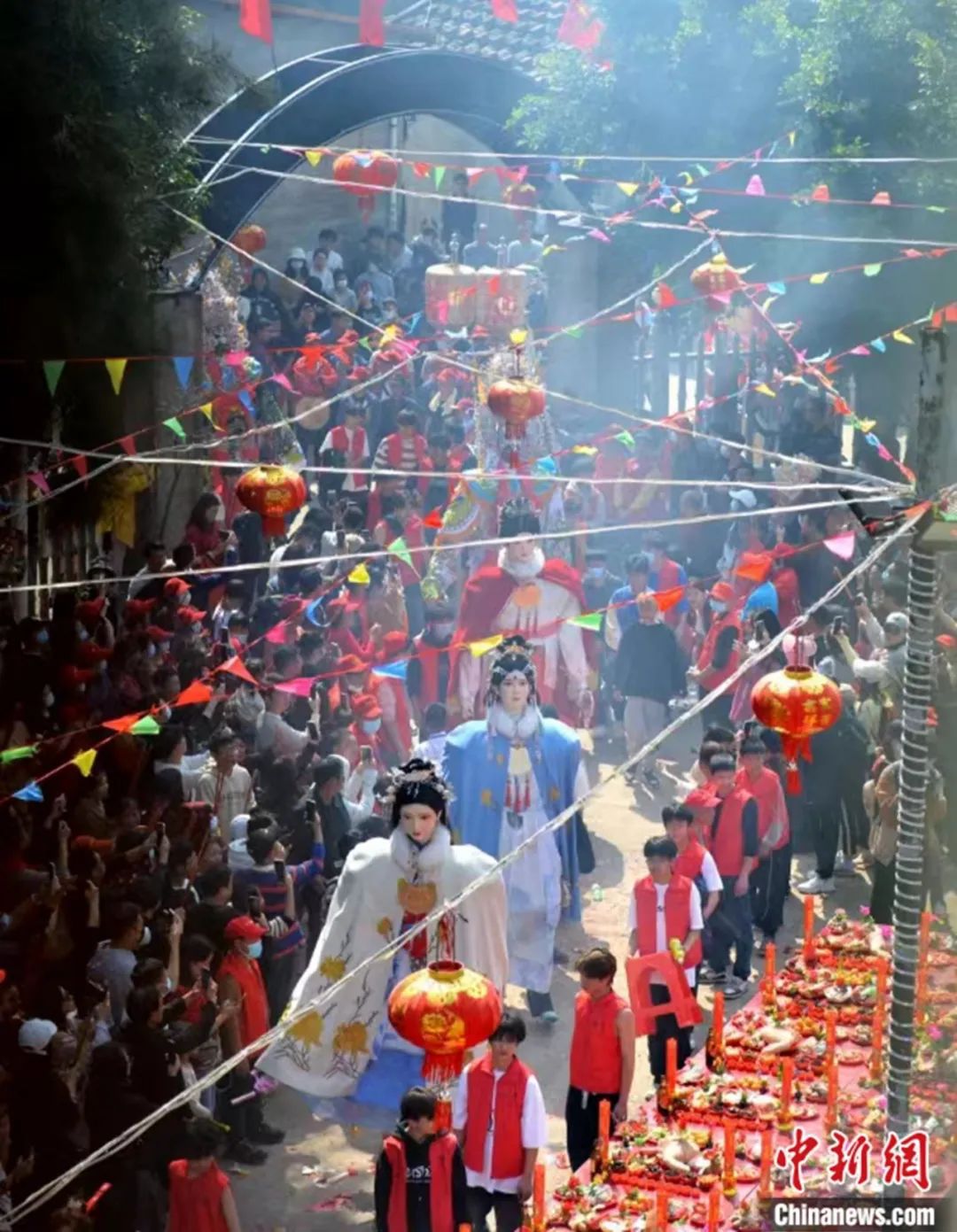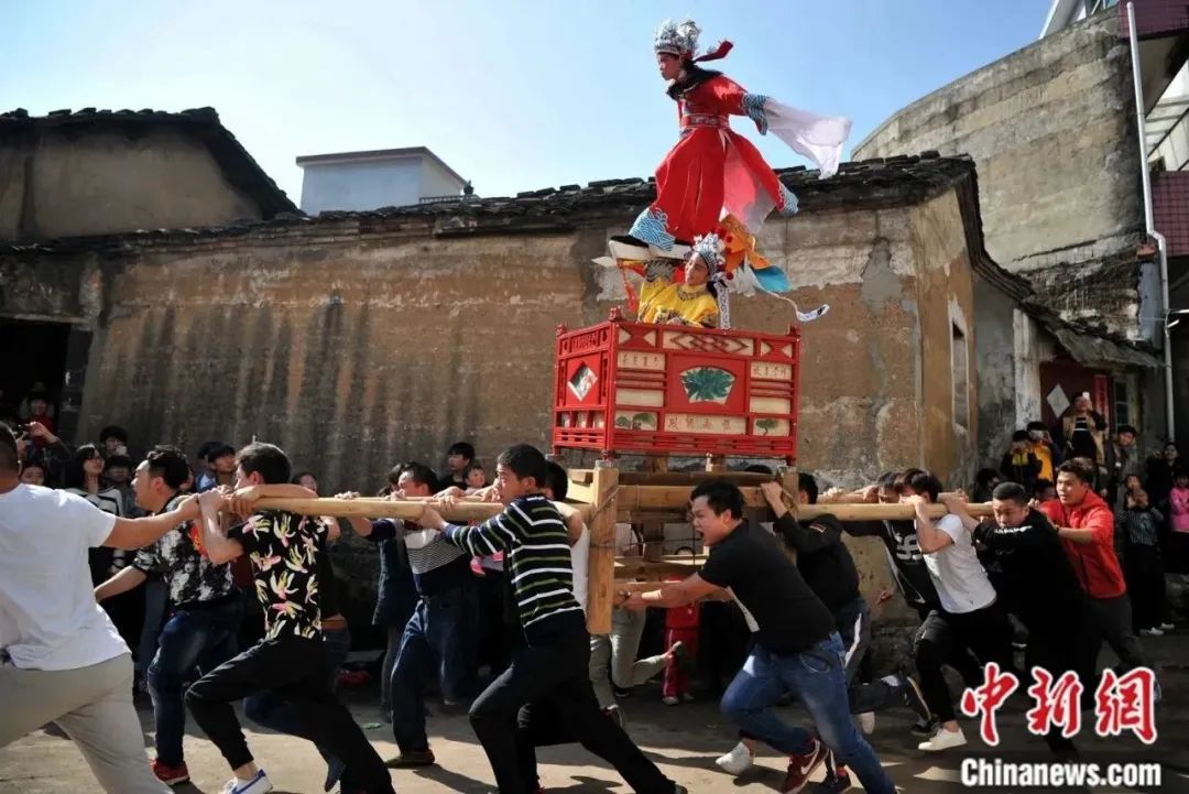 每年正月初十及正月二十六,潭頭鎮(zhèn)厚福村都會舉行傳統(tǒng)游神民俗活動,至今已有400多年的歷史。圖為傳統(tǒng)游神民俗活動中的巡游隊伍簇?fù)碇ι駥⒌娜俗呓执?。中新社記?呂明 攝