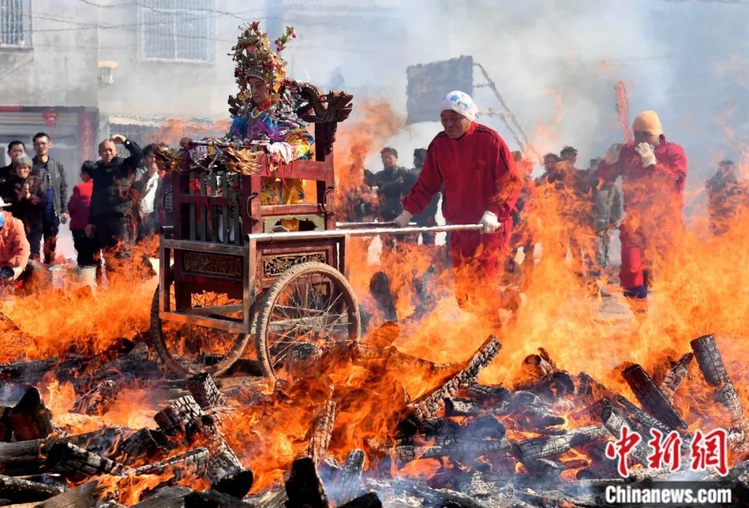 村民們抬著“古事棚”在村莊里狂奔。中新社記者 張斌 攝