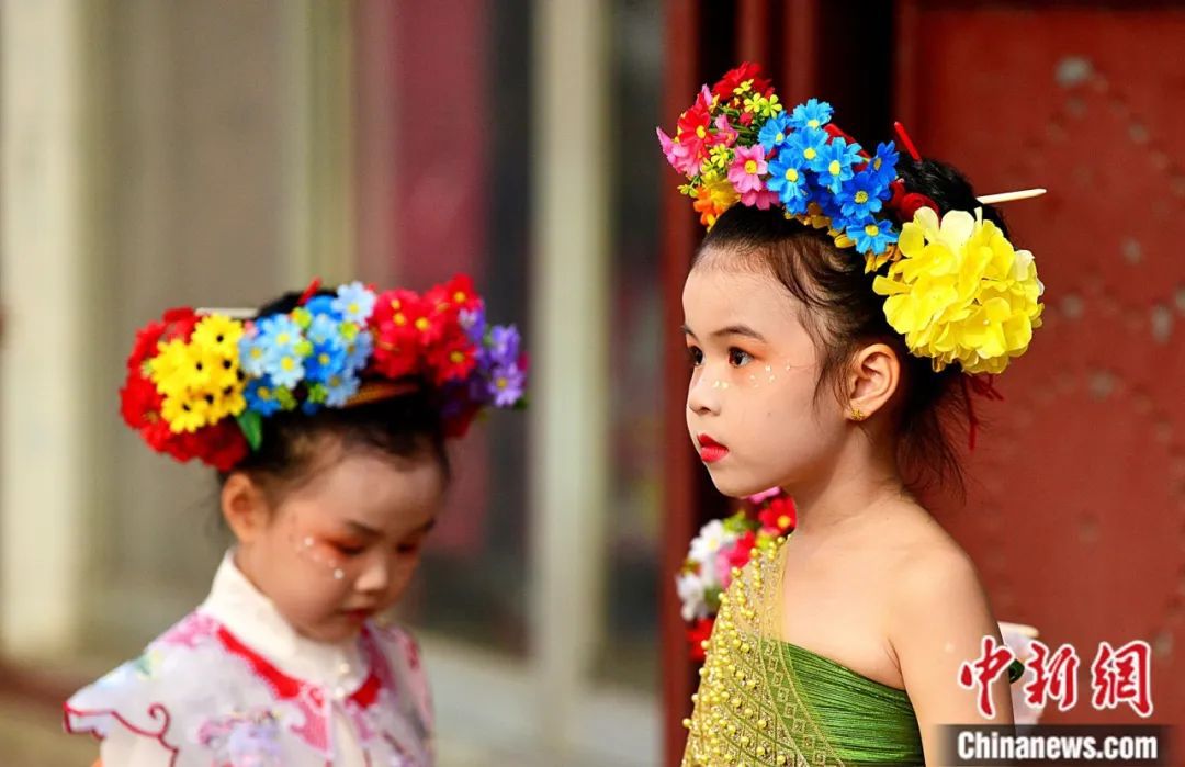 村民正在為參加“走古事”的兒童化妝穿衣。據(jù)了解,每個古事棚上有兩位身著戲袍,化上戲妝,扮成李世民、薛仁貴、劉邦、楊六郎、劉備等歷史人物的小朋友,入選的小朋友要求相貌端正,膽子大。中新社記者 張斌 攝