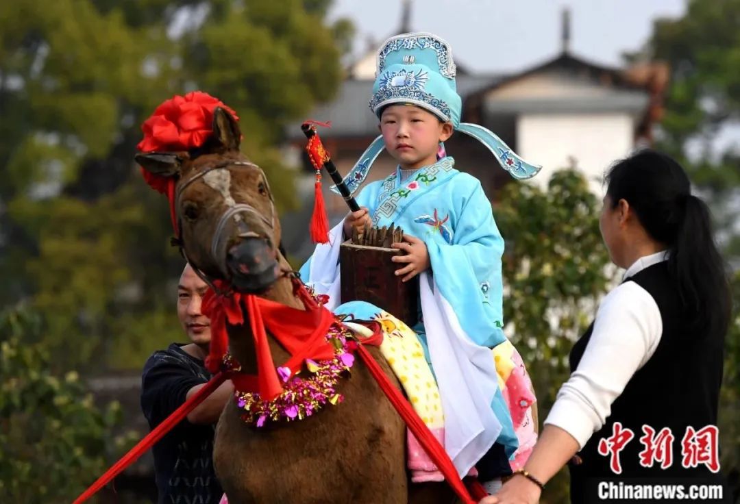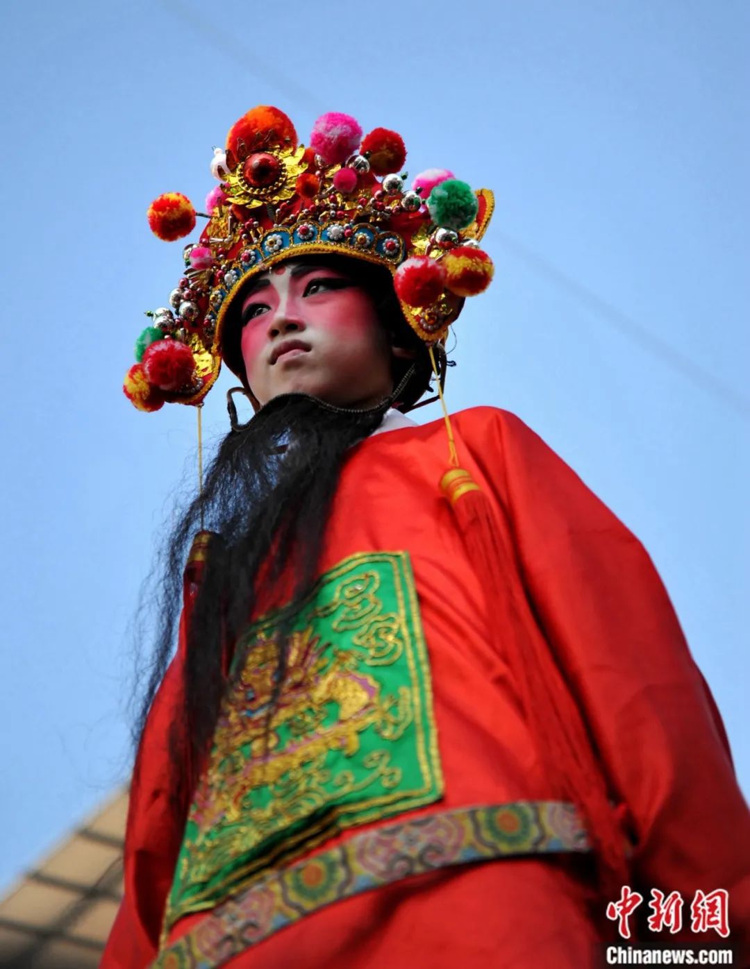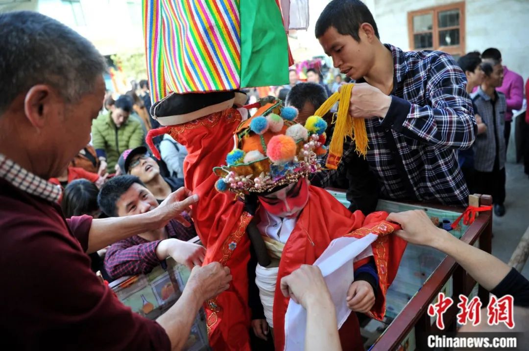連城縣羅坊鄉(xiāng)舉行國家級非物質(zhì)文化遺產(chǎn),享有“中國客家狂歡節(jié)”美譽的“走古事”民俗活動。圖為立于轎臺之上參加“走古事”的兒童。中新社記者 張斌 攝