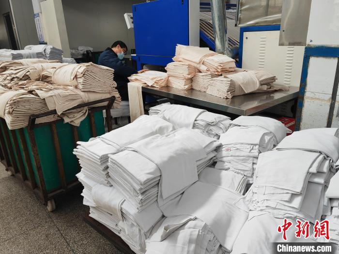 鐵路洗滌工打包清洗干凈的臥具。陳有會 攝