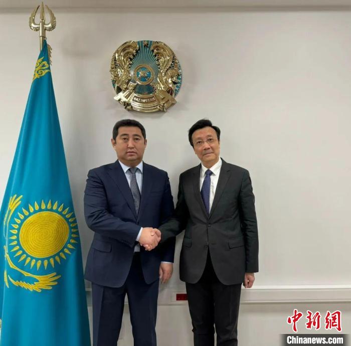 當(dāng)?shù)貢r(shí)間3月4日,大使張霄(右一)會(huì)見(jiàn)哈農(nóng)業(yè)部長(zhǎng)薩帕羅夫。中國(guó)駐哈薩克斯坦大使館供圖