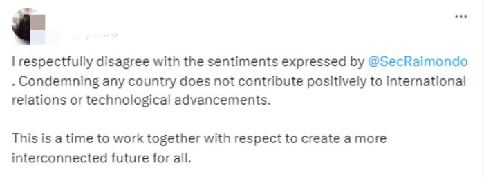 還有網(wǎng)友表示,譴責(zé)任何國(guó)家,不會(huì)對(duì)國(guó)與國(guó)之間的關(guān)系和科技進(jìn)步帶來(lái)積極貢獻(xiàn),“現(xiàn)在是時(shí)候共同努力,為所有人創(chuàng)造一個(gè)更好溝通的未來(lái)。”