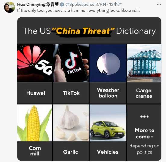 華春瑩最后回?fù)?,“如果你唯一的工具是錘子,那么所有東西看起來都像釘子?!边@條帖文隨附圖片上,列出美國以往炒作“中國威脅”的詞典:包括華為,TikTok,氣象無人飛艇,起重機(jī),玉米加工廠,大蒜,汽車……還有更多,取決于政治因素?!?/p>