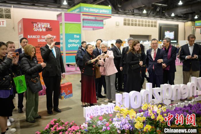 當(dāng)?shù)貢r(shí)間3月2日,一年一度的費(fèi)城花展在美國(guó)賓夕法尼亞州費(fèi)城開(kāi)幕,以“功夫鄭州——花俏嵩山”為主題的鄭州展園當(dāng)天在花展上亮相。圖為中國(guó)駐紐約總領(lǐng)事黃屏(右三)帶領(lǐng)嘉賓參觀鄭州展園?!ranck Zhou 攝
