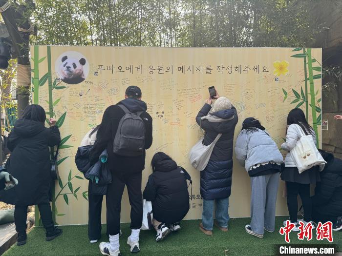 熊貓世界外設(shè)有一塊大型留言板供游客留言。記者看到板上有用圓珠筆畫(huà)的大熊貓形象,還有用韓語(yǔ)寫(xiě)的留言:“福寶,有你真好!”“希望我家孩子幸福,永遠(yuǎn)健康!”“我愛(ài)你福寶,祝你永遠(yuǎn)幸福!”
