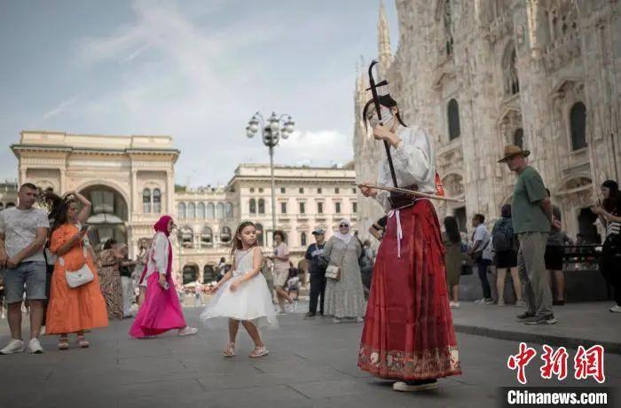 2023年8月,山東濰坊留學(xué)生鄭曉慧身穿馬面裙在意大利米蘭街頭演奏二胡。(鄭曉慧供圖)