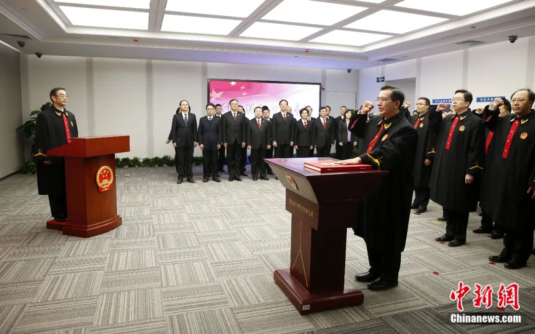 2019年1月1日,中國(guó)最高人民法院知識(shí)產(chǎn)權(quán)法庭在北京揭牌成立,最高法知識(shí)產(chǎn)權(quán)法庭全體法官進(jìn)行憲法宣誓。李慧思 攝