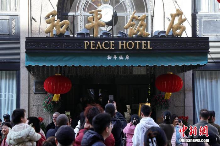 游客在和平飯店門前拍照留念。中新網(wǎng)記者 湯彥俊 攝