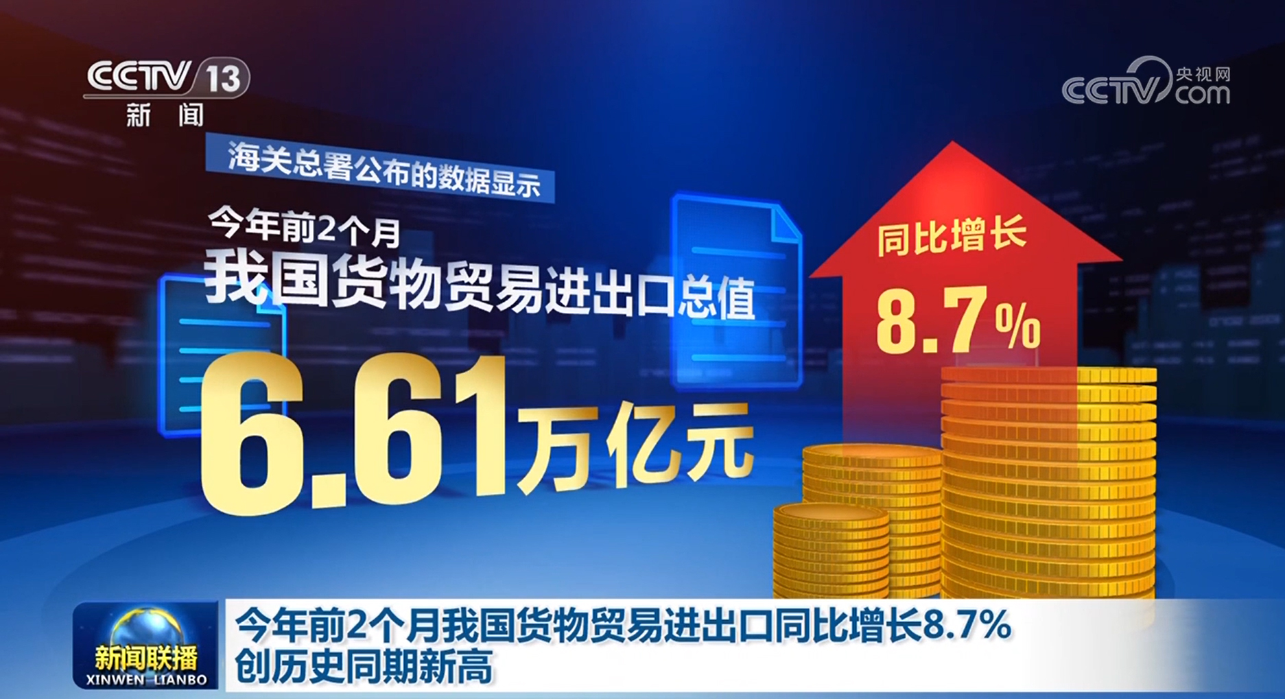央視網(wǎng)消息(新聞聯(lián)播):記者今天(3月7日)從海關(guān)總署獲悉,今年前2個(gè)月,我國(guó)貨物貿(mào)易進(jìn)出口規(guī)模創(chuàng)歷史同期新高,外貿(mào)實(shí)現(xiàn)良好開局。