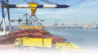 一批工程車輛在山東港口煙臺(tái)港裝入中非班輪,將發(fā)往幾內(nèi)亞馬瑞巴亞港,投入當(dāng)?shù)鼗A(chǔ)設(shè)施建設(shè)。