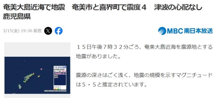 中新網(wǎng)3月15日電 據(jù)“南日本放送”消息,當?shù)貢r間3月15日19時32分,日本奄美大島近海發(fā)生5.5級地震。