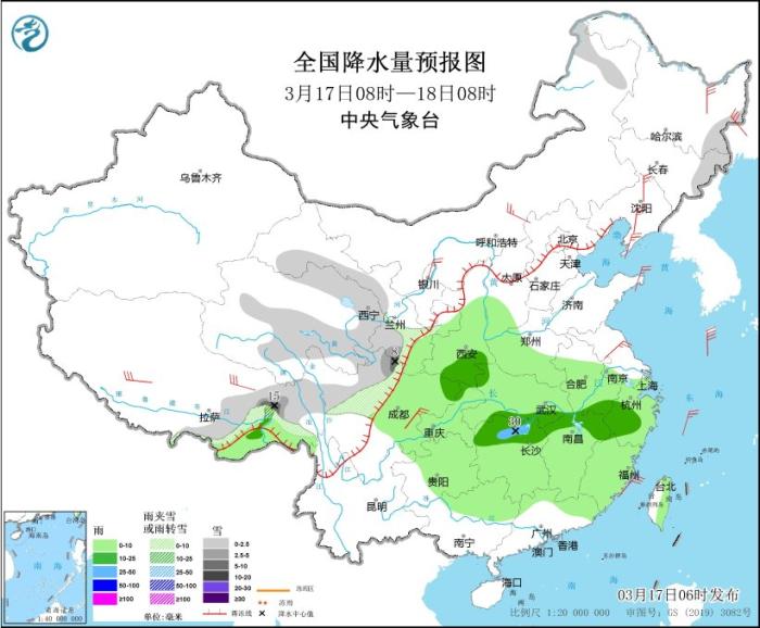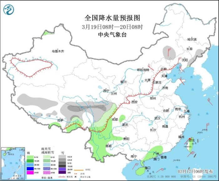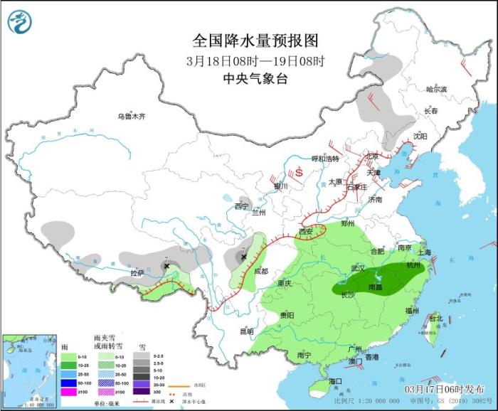 3月17日08時(shí)至18日08時(shí),西藏東部、青海東北部和南部、甘肅南部、川西高原北部、內(nèi)蒙古東北部、黑龍江東部、吉林東部等地部分地區(qū)有小到中雪或雨夾雪,其中,西藏東部、川西高原北部等地局部地區(qū)有大到暴雪(10~15毫米)。西藏東南部、西北地區(qū)東部、西南地區(qū)東部、黃淮西部、江淮中西部、江漢、江南、華南北部等地部分地區(qū)有小到中雨,其中,湖南北部等地部分地區(qū)有大雨(25~30毫米)。內(nèi)蒙古中西部、黑龍江東部、遼寧中北部、遼東半島、山東半島、江蘇中部、四川盆地中部等地部分地區(qū)有4~6級(jí)風(fēng)。