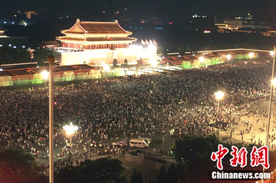 2001年7月13日晚,北京天安門廣場人潮涌動(dòng),數(shù)以十萬計(jì)的民眾徹夜不眠慶祝北京申奧成功。毛建軍 攝