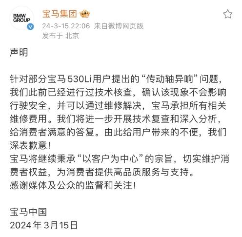 當(dāng)晚,寶馬集團(tuán)也發(fā)布聲明稱,“針對部分寶馬530Li用戶提出的‘傳動軸異響’問題,我們此前已經(jīng)進(jìn)行過技術(shù)核查,確認(rèn)該現(xiàn)象不會影響行駛安全,并可以通過維修解決,寶馬承擔(dān)所有相關(guān)維修費(fèi)用。我們將進(jìn)一步開展技術(shù)復(fù)查和深入分析,給消費(fèi)者滿意的答復(fù)。由此給用戶帶來的不便,我們深表歉意!”