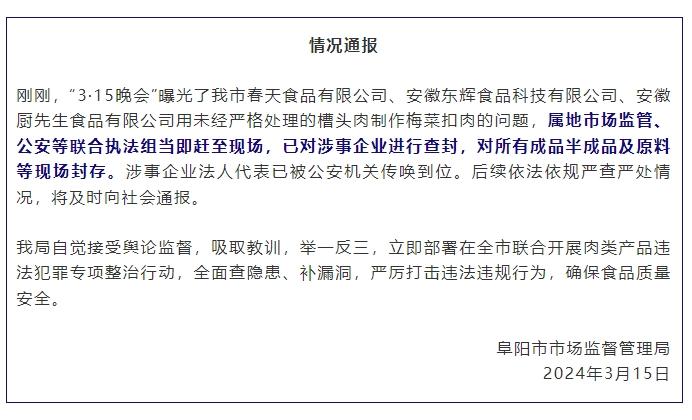 涉事企業(yè)所在的阜陽市市場監(jiān)督管理局當(dāng)晚發(fā)布情況通報稱,屬地市場監(jiān)管、公安等聯(lián)合執(zhí)法組當(dāng)即趕至現(xiàn)場,已對涉事企業(yè)進(jìn)行查封,對所有成品半成品及原料等現(xiàn)場封存。涉事企業(yè)法人代表已被公安機(jī)關(guān)傳喚到位。后續(xù)依法依規(guī)嚴(yán)查嚴(yán)處情況,將及時向社會通報。