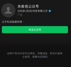 涉及主板機(jī)黑灰產(chǎn)業(yè)鏈的云機(jī)俠(深圳)科技有限公司,其微信公眾號顯示涉嫌違規(guī),賬號已被停止使用;其短視頻賬號已被相關(guān)平臺封禁;該公司官網(wǎng)目前也不能打開。