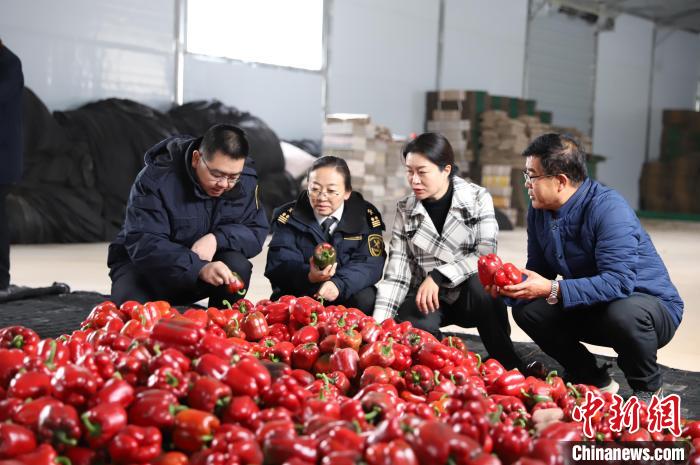 圖為西寧海關(guān)工作人員對出口的彩椒進(jìn)行檢查。 西寧海關(guān) 供圖