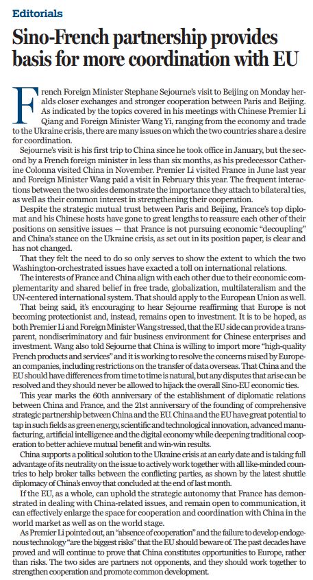 今年是中法建交60周年,也是中歐建立全面戰(zhàn)略伙伴關(guān)系21周年。中歐在綠色能源、科技創(chuàng)新、先進(jìn)制造、人工智能、數(shù)字經(jīng)濟(jì)等領(lǐng)域大有可為,同時(shí)也要深化傳統(tǒng)合作,更好實(shí)現(xiàn)互利共贏。