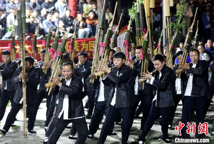 圖為4月4日清明節(jié),廣西三江侗族自治縣獨峒鎮(zhèn)10余支蘆笙隊齊聚一堂,以蘆笙踩堂、蘆笙比響等形式,展示侗鄉(xiāng)多彩風(fēng)情。龔普康攝