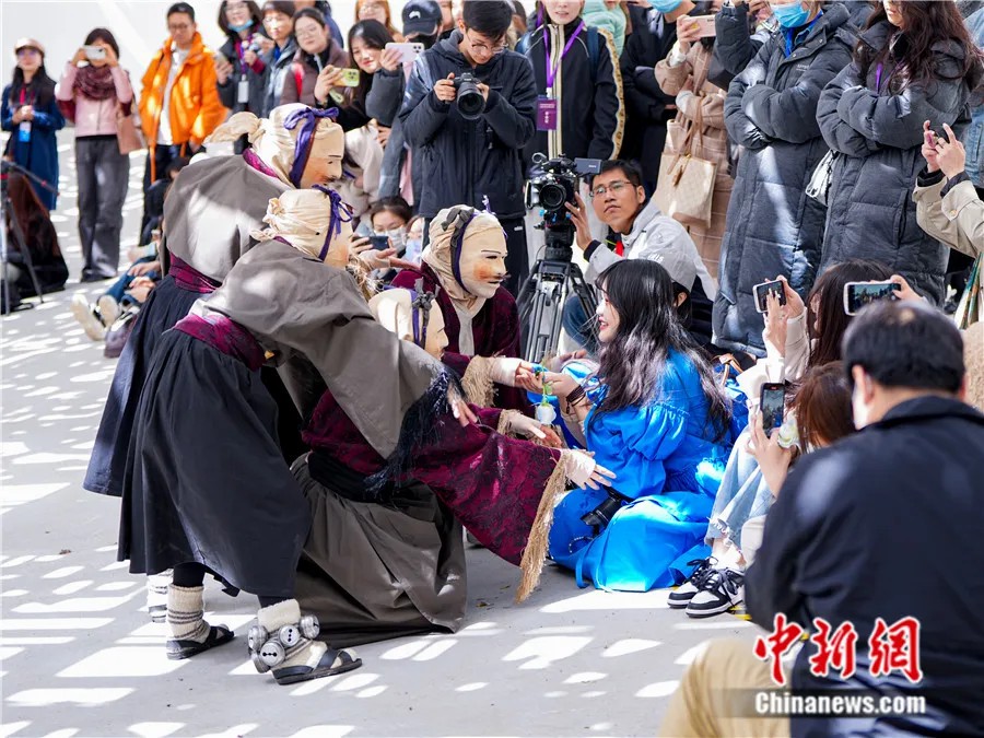 2024年3月28日,2024年世界戲劇日慶典活動中,參加戲劇工坊演出的智利劇團(tuán)演員與觀眾互動?;顒又鬓k方供圖
